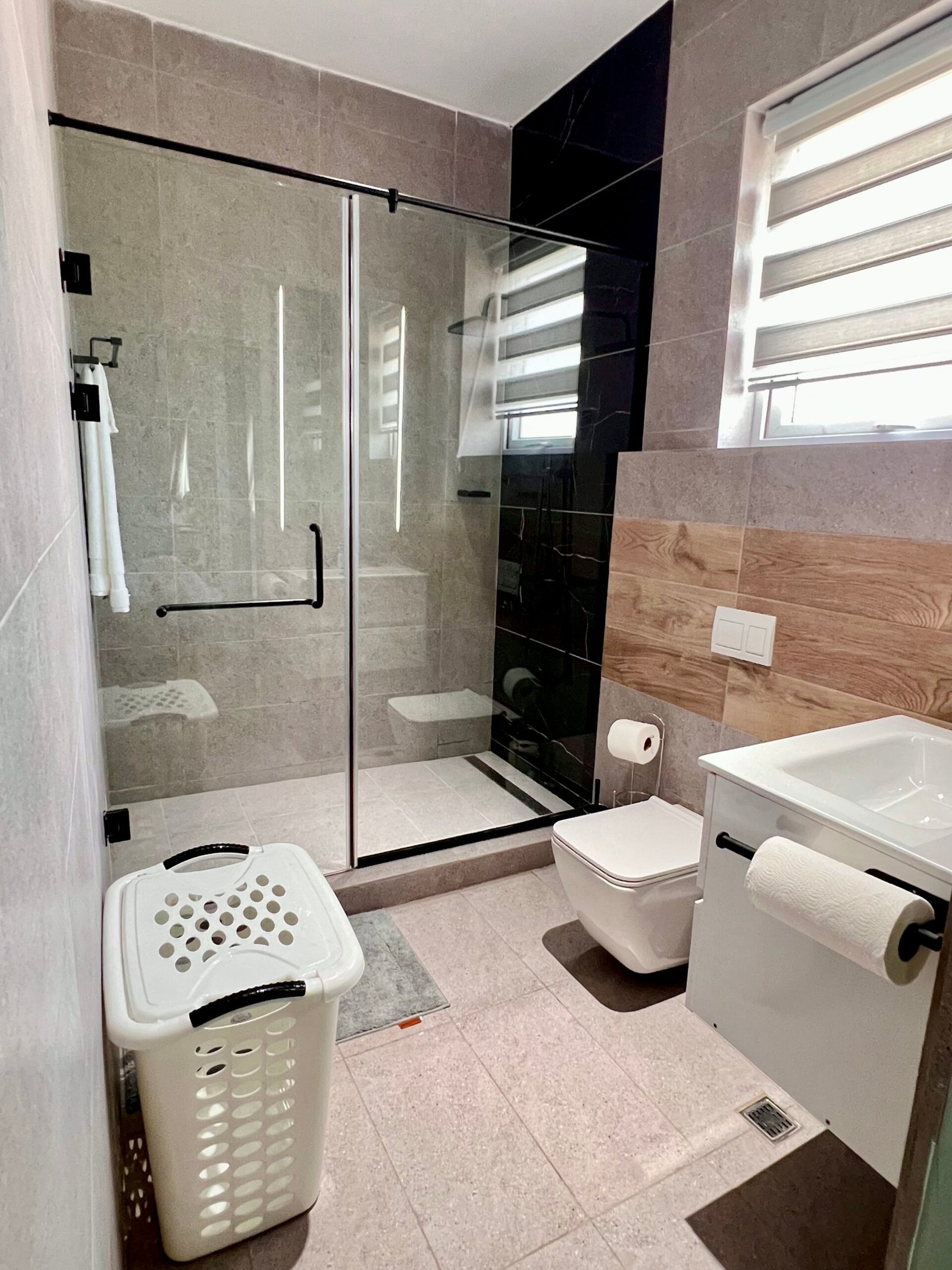 The bedroom offers a plush queen-sized bed with premium linens for a restful night’s sleep, a spacious closet, a 43-inch TV, and an en-suite bathroom with a sleek walk-in shower.