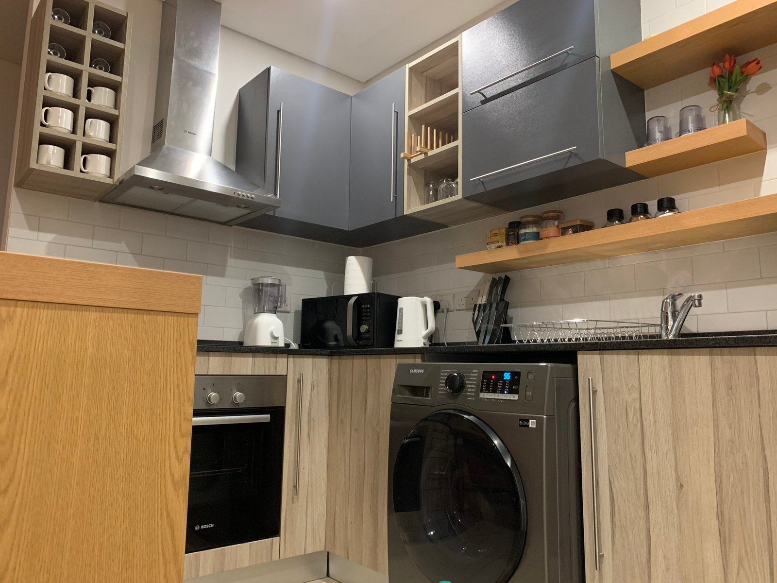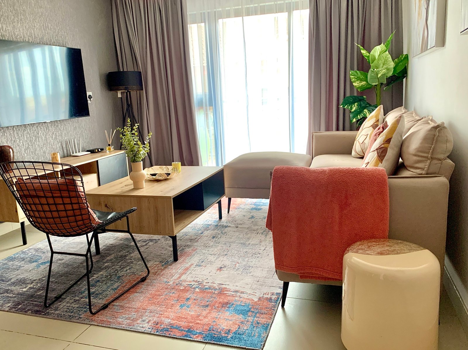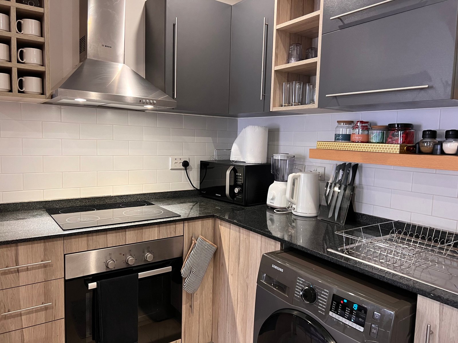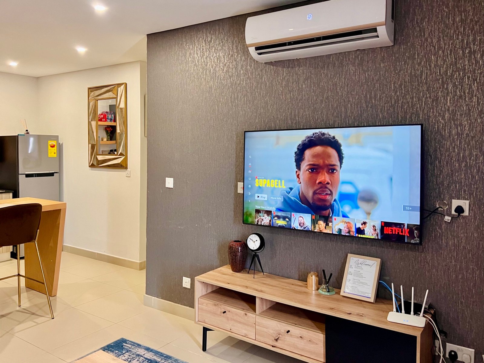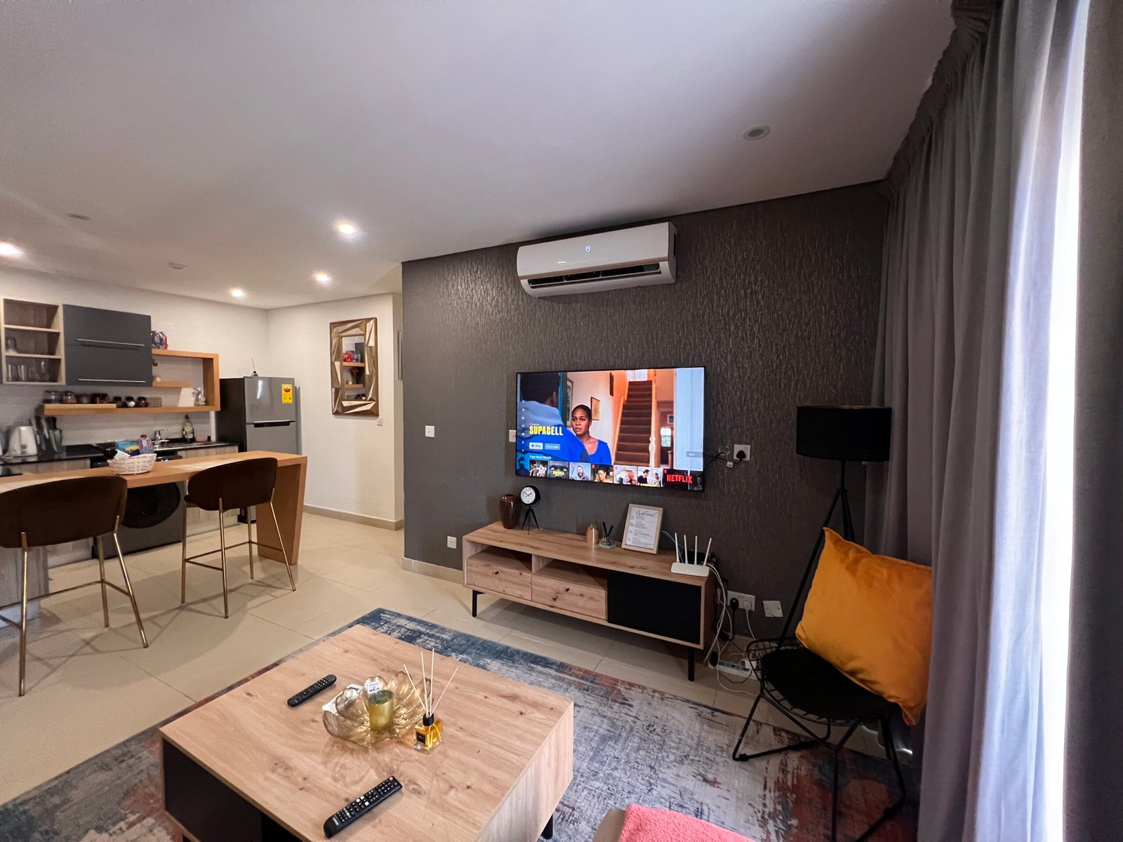 This modern 1-bedroom apartment offers the perfect blend of comfort and convenience. The open-plan kitchen comes fully equipped with sleek appliances, while the living area features a smart TV and comfortable seating for relaxation. The bedroom is a peaceful retreat with a plush bed, generous storage, and its own smart TV.