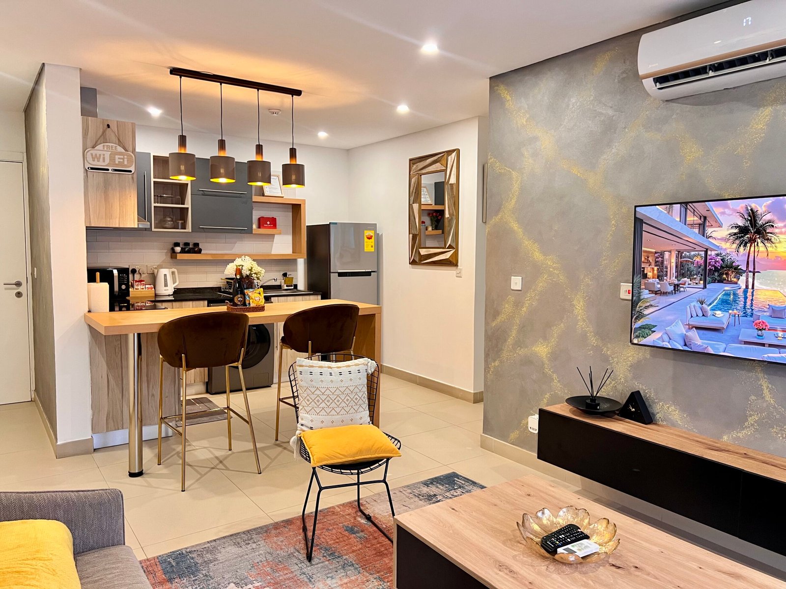 Modern 1 bed, 1.5 bath apartment in prime East Legon. Features an open kitchen, tastefully styled living space, en-suite bedroom, guest washroom, fast WiFi, DSTV, rooftop pool, gym, secure parking, and backup power. Close to top cafés, Melcom shopping mall & A&C mall