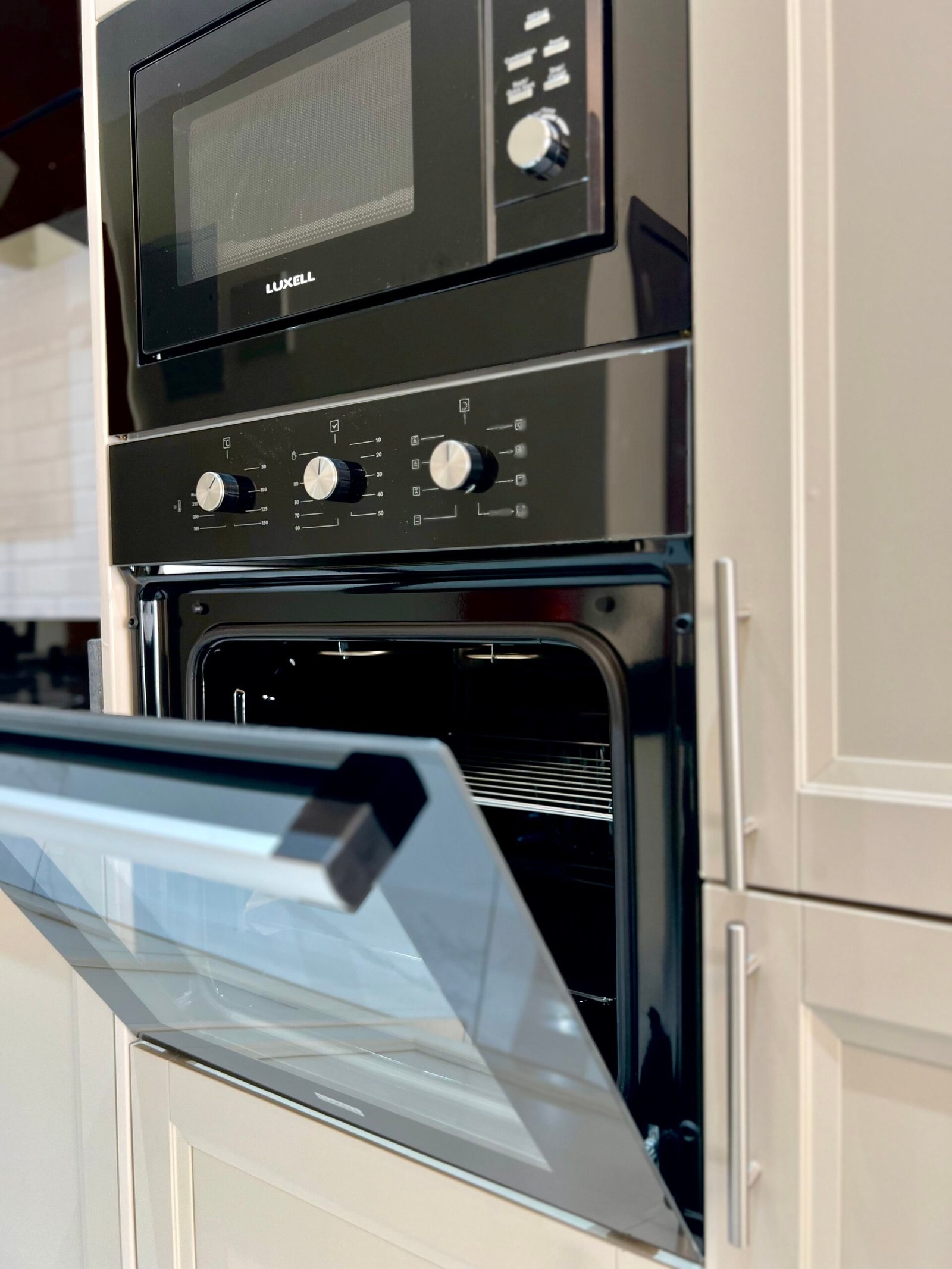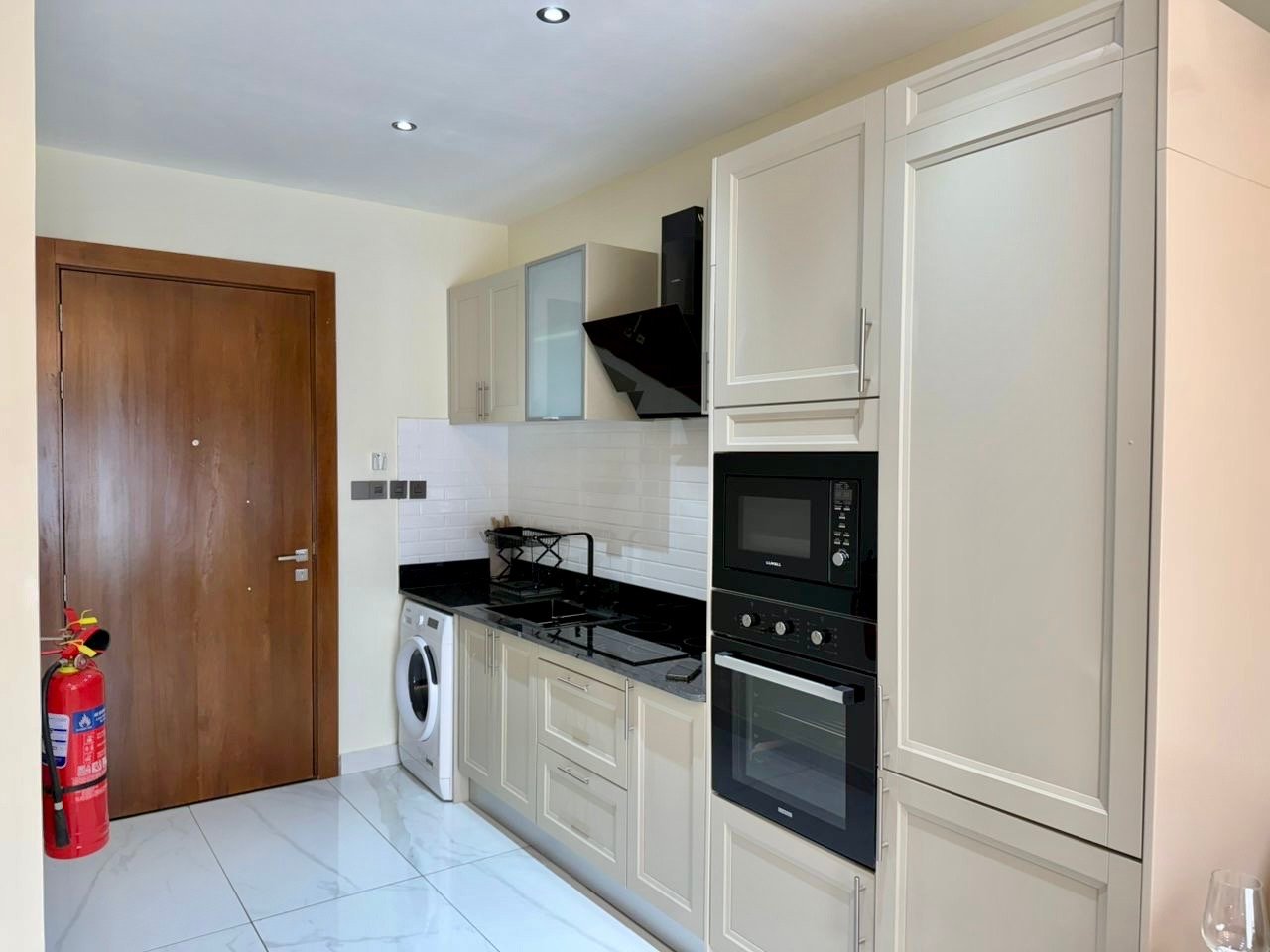 The kitchen is fully equipped with quality appliances, including an oven, microwave, washing machine, and plenty of cabinet space.