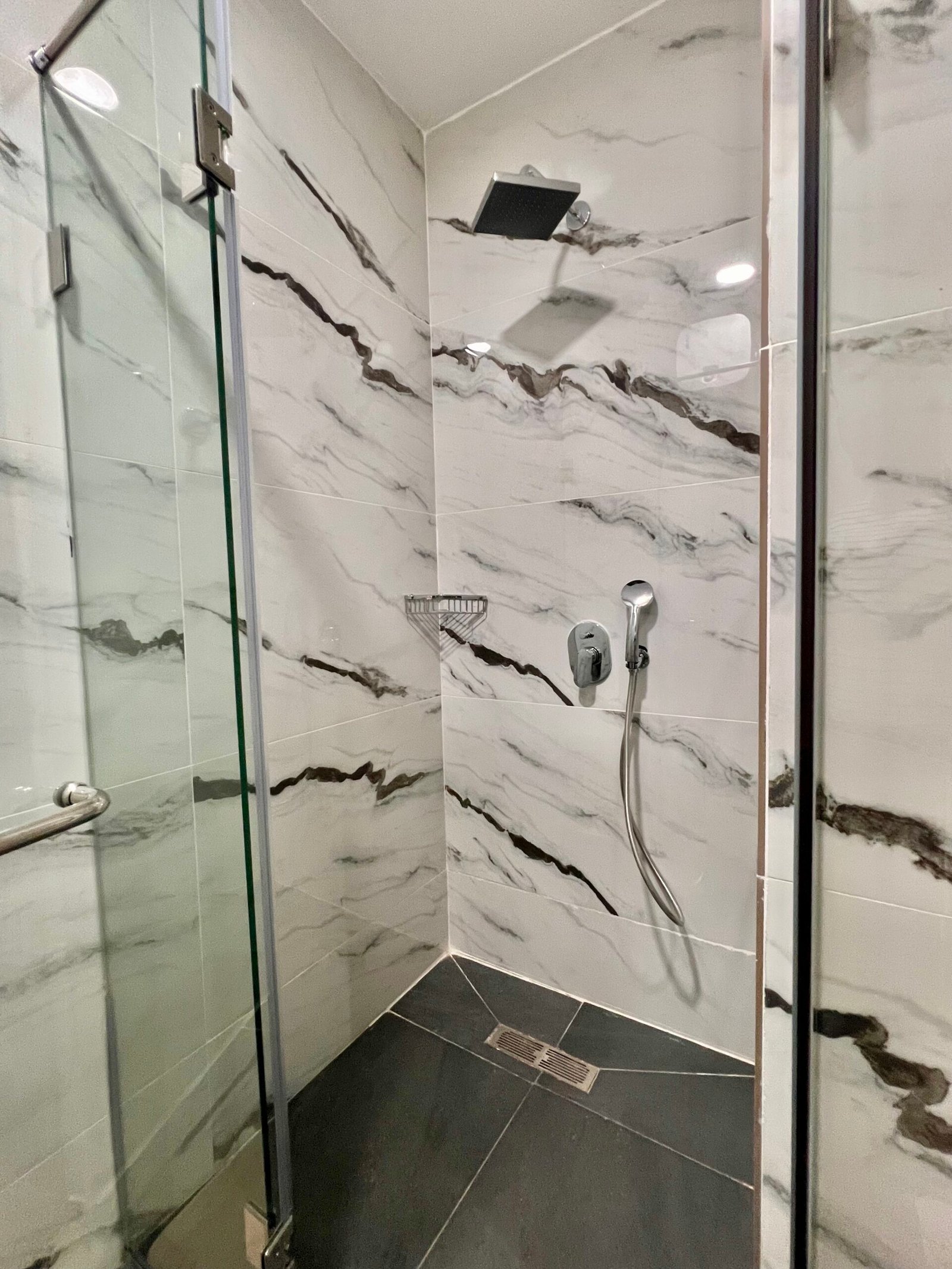 The bedroom is designed for comfort, with a bold feature wall, luxury bedding, and blackout curtains to help you sleep well. The en-suite bathroom has marble-style tiles and modern fixtures, and there’s a guest washroom for convenience.